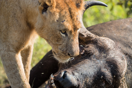 彼の アフリカの ライオン 獲物 岬 保護 東 バッファロー アフリカ 死んだ ライオン Kenya ケープバッファロー Canstock